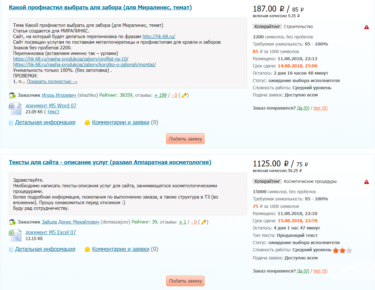 - Возможность попрактиковаться. Стать профессионалом быстро не получится, чем больше написанных статей и исправленных в процессе ошибок – тем выше уровень мастерства. На бирже вы найдете большое количество заданий на различные темы.