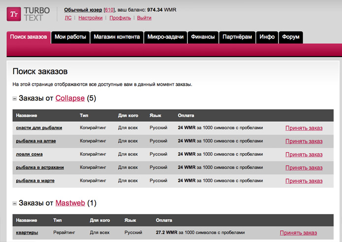 Turbotext.ru – основан в 2009 году. Конкуренция на сервисе очень высокая, зато есть возможность зарабатывать не только на копирайтинге, но и выполнении мелких задач, например, нужно оставлять комментарии на форумах или подписываться в соцсетях. Прежде чем начать, нужно пройти тест на знание русского языка и написать сочинение. Те, кто сдал его на 5 баллов могут брать все заказы, а с 4 баллами в ленте заказов будут отображаться только их часть. Если исполнитель сдал на 3 балла, он сможет выполнять только микрозадачи.